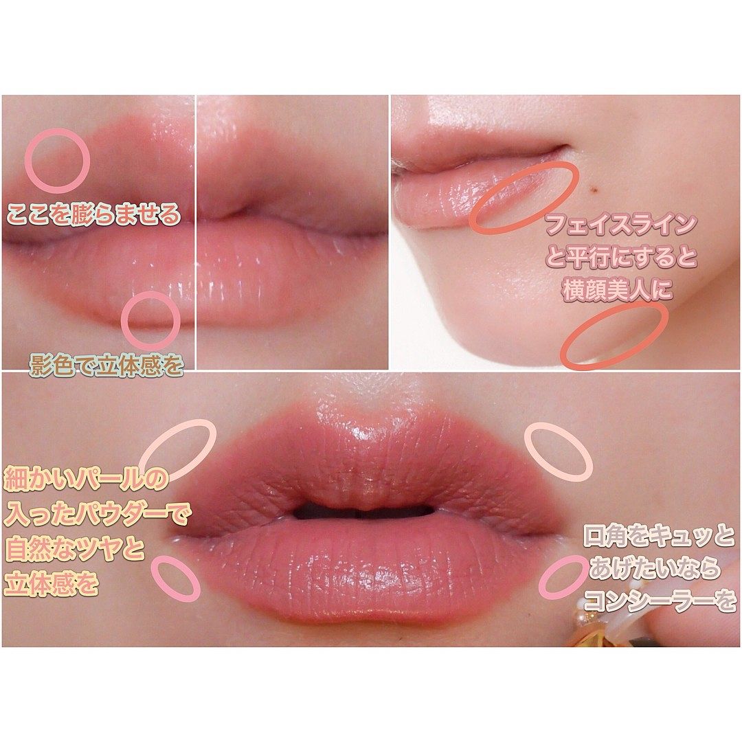接著可用帶有珠光的蜜粉在上唇周的側邊打亮增加立體感,下唇角的部分則可以用遮瑕來修飾,讓下嘴角輪廓收進去,看起來更緊緻!