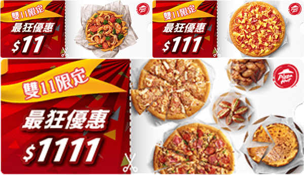 沒搶到券的話也有加碼推出的「雙11官網優惠套餐」:外帶兩個大比薩(或外送一個大比薩、一個小比薩),加上黃金和風鱈魚塊(10個)、1.25L可樂1瓶,只要1,111元!