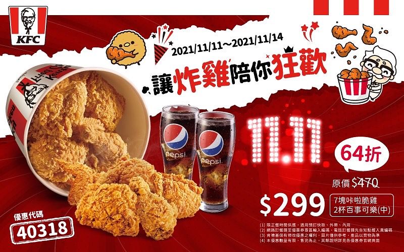 肯德基推出炸雞桶餐限時優惠,從11月11日至11月14日,雙11炸雞桶餐限定推出,原價NT.470的7塊炸雞桶餐加上2杯中杯可樂,於活動期間輸入優惠代碼40318,期間限定價只要NT.299,狂嗑炸雞現省171元。雙11炸雞桶餐優惠碼於肯德基全台門市、官網預訂快取及PK雙饗卡App皆可使用。