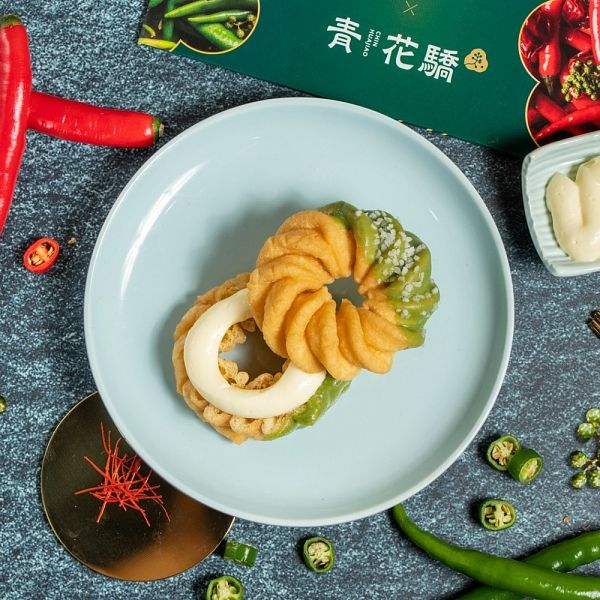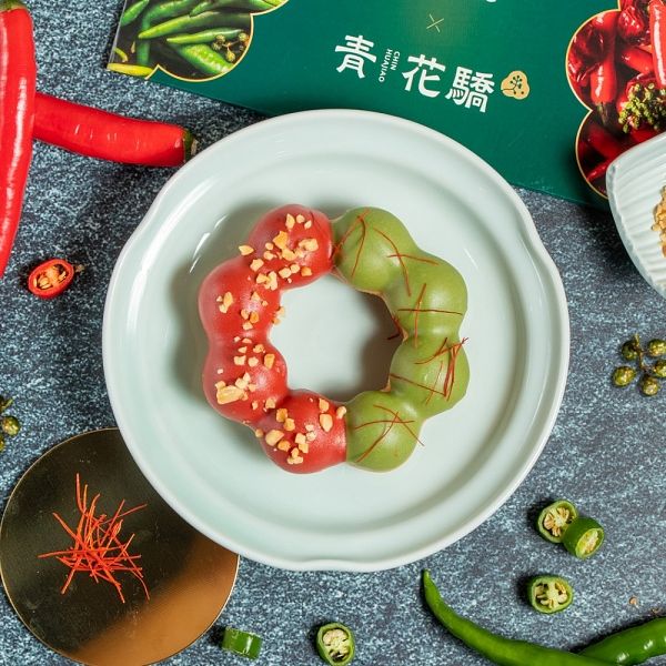 圖片來源:Mister Donut不只是鹹辣派,還有甜辣風~甜甜圈辣辣吃也別有一番風味!同樣嚴選辛麻青花椒與爽辣川味鮮紅辣椒添加在可可醬中,經典復刻甜辣版青紅雙鍋的「青紅麻辣波堤」,如同鴛鴦鍋般兩種風味一次體驗!還有麻辣X花生的熱門吃法「麻辣花生醬波堤」將當紅Q彈波堤剖半抹上帶有顆粒口感且能綜合辣感的花生醬鮮奶油,半邊沾上帶有川味鮮紅辣椒風味的紅辣可可醬,同時畫上青麻可可醬線條增添麻感,最後灑上花生碎粒提升口感,可甜可麻還可辣的甜辣風甜甜圈再+1~最後青花驕全台首創青花椒冰淇淋也優雅化身甜辣風甜甜圈一員,「青麻香草法蘭奇」選用帶有泡芙般鬆軟口感的法蘭奇剖半擠上擁有牛奶與香草風味的卡士達內餡,側邊再裹上翠綠青麻可可醬,即使變身甜甜圈依舊能三吃,一圈兩吃個別感受單純香草牛奶風味及帶有青花椒麻感的青麻可可醬,兩風味一起入口即能感受青花椒麻味與香草卡士達奶味交融,瞬間降低辣度,最後還有細緻脆口珍珠糖粒點綴增添口感,典雅翠綠不只美味還好拍!