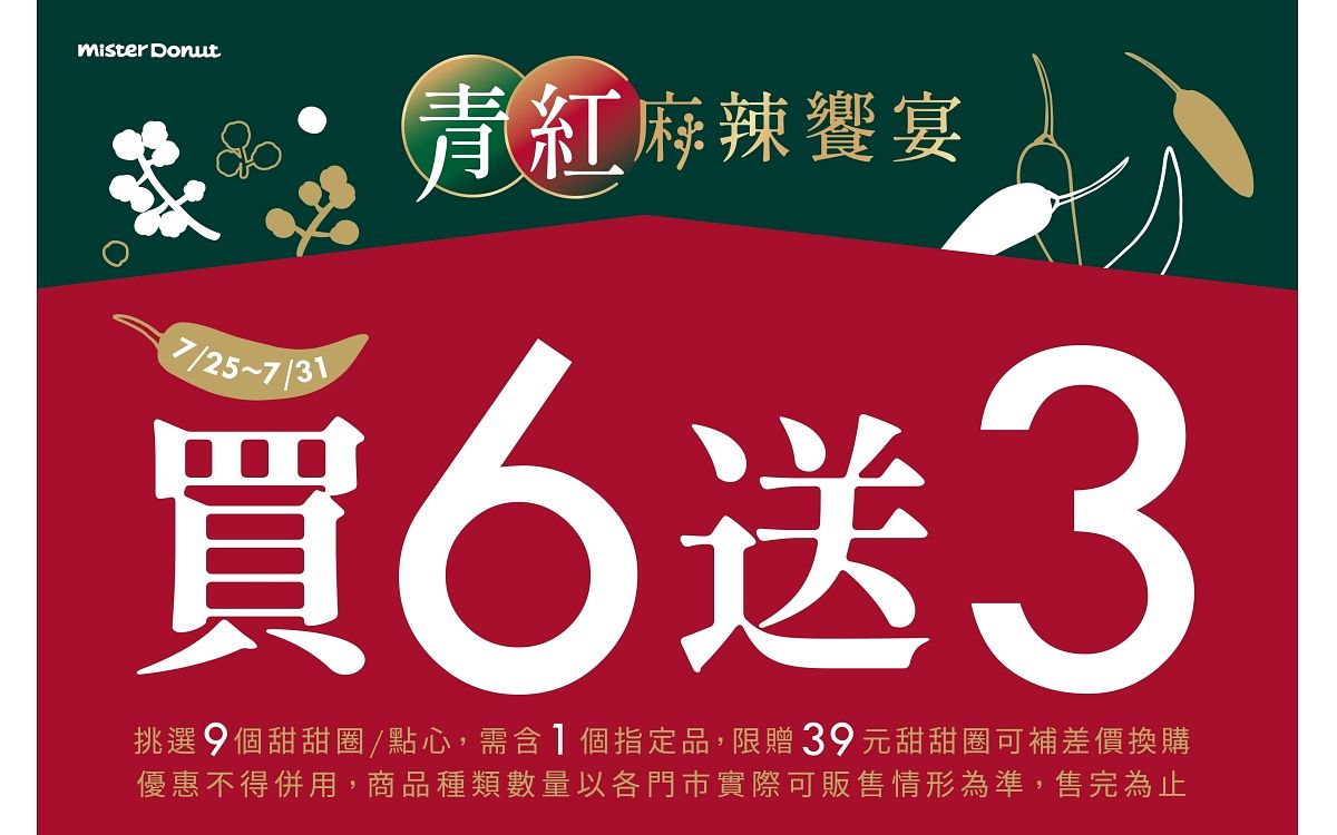 圖片來源:Mister DonutMister Donut為迎接與青花驕的首次合作釋出買6送3的優惠活動,只要於7/25(二)~7/31(一)期間購買指定商品即可享買6送3優惠活動,青花驕也釋出超多驕客專屬好禮!只要下載「王品瘋美食App」成為會員,並符合活動條件3重優惠通通有!第一重優惠只要進入指定活動網站登錄【王品瘋美食會員手機號碼】並輸入【Mister Donut 限定碼】,即可獲得青花驕獨家好禮「青花椒麻口水雞」乙份(價值298元)。第二重優惠只要成為王品瘋美食App會員,即可享 Mister Donut X青花驕聯名商品買4送2獨家優惠,最後一重優惠則是自 7/25(二)~9/30(六)期間註冊為王品瘋美食 App 新會員,另可參加好禮抽獎,有機會免費獲得 Mister Donut 蜜糖波堤兩入甜甜圈電子體驗券,這個盛夏就讓Spicy來解放你的熱!