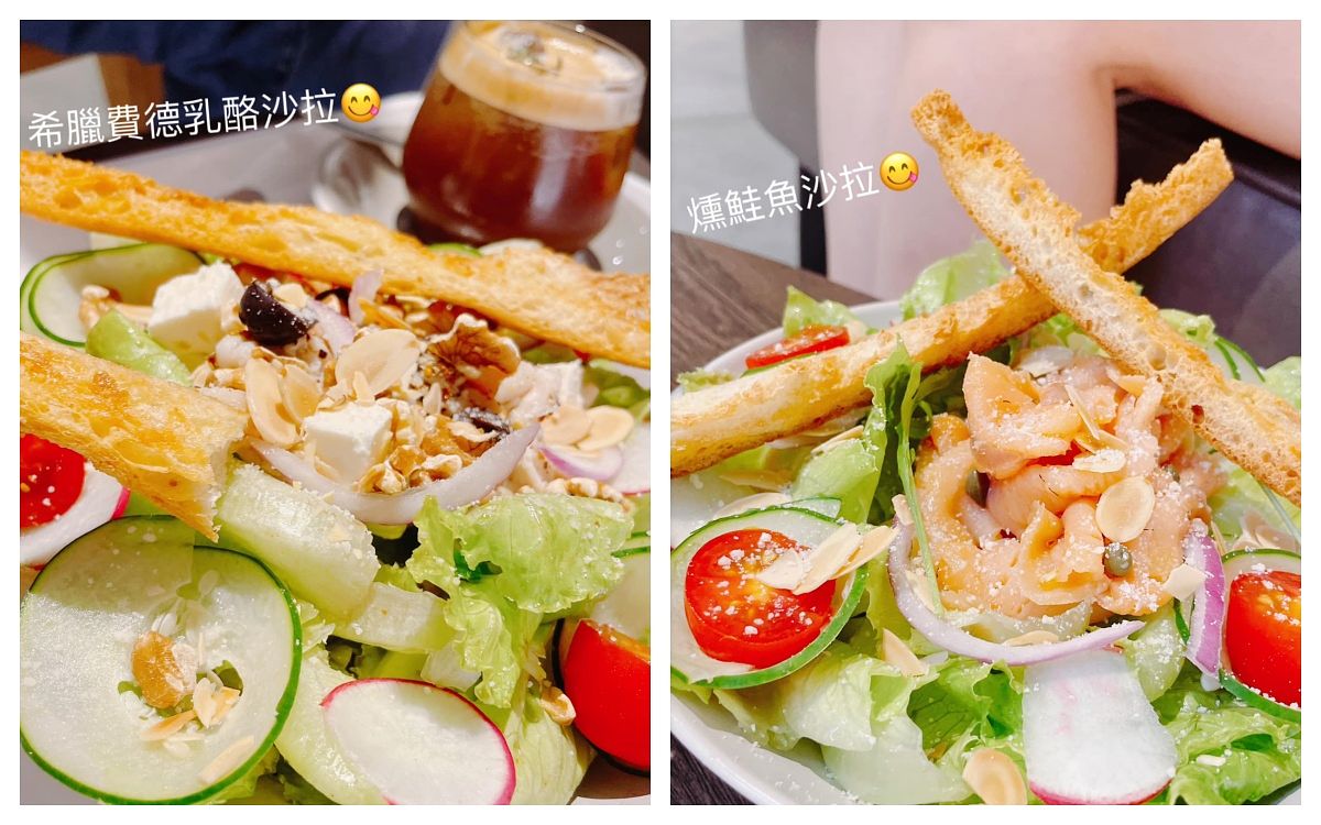 這邊的沙拉非常值得推薦,食材全部現切現刨,「燻鮭魚沙拉/清爽柑橘醬」擺盤非常可愛,鮭魚量也很多,另一份是「希臘費德乳酪沙拉/義大利紅酒醋」,每款沙拉也會配上用初榨橄欖油烤過的法國麵包條,感覺可以吃得飽。