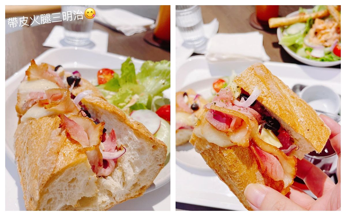 我點的是「帶皮火腿三明治」,這個非常好吃,除了法式帶皮火腿,佐以卡門貝爾乾酪及哈伐第切片乾酪,還有我最愛的芥末籽醬,麵包還烤得酥酥的!但比較麻煩的是得大口咬,為了不要刮破嘴,只好小口小口慢慢吃!