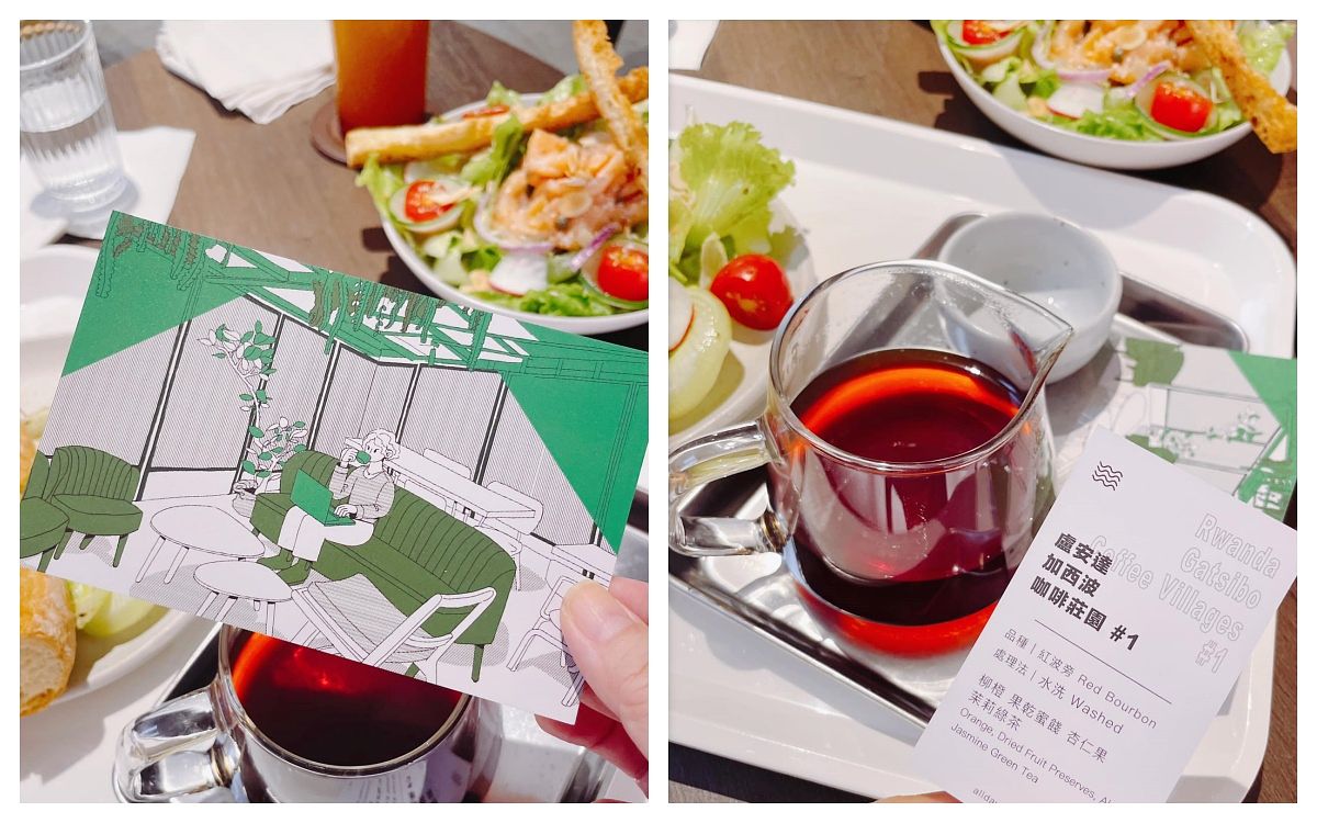 飲料我點了「盧安達加西波咖啡莊園」,其實我不太會選,但基本上我都喝酸度高的,加上它有“果乾蜜餞”關鍵字應該沒問題!果然還蠻好喝的喔!重點是有附上“咖啡的身份證”,及一張很漂亮的明信片(這插圖就是我們坐的位置呀)。