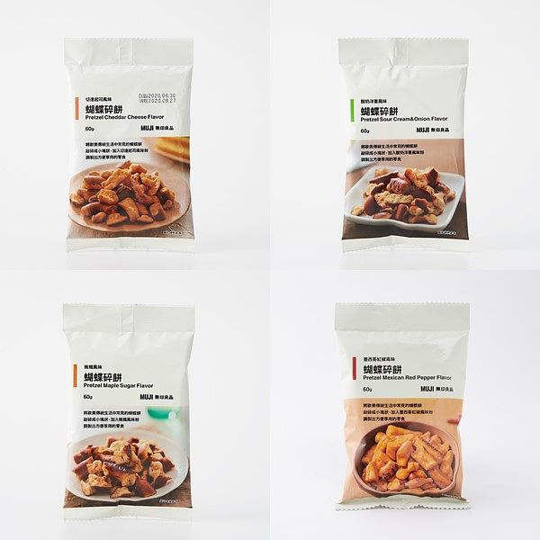 將歐美傳統生活中常見的蝴蝶餅敲碎成小塊狀,加入各式風味粉,調製出方便享用的零食。MUJI無印良品的蝴蝶碎餅提供楓糖、酸奶洋蔥和切達起司風味,其中以酸奶洋蔥風味最受消費者喜愛,本周也推出新品墨西哥紅椒風味上市。