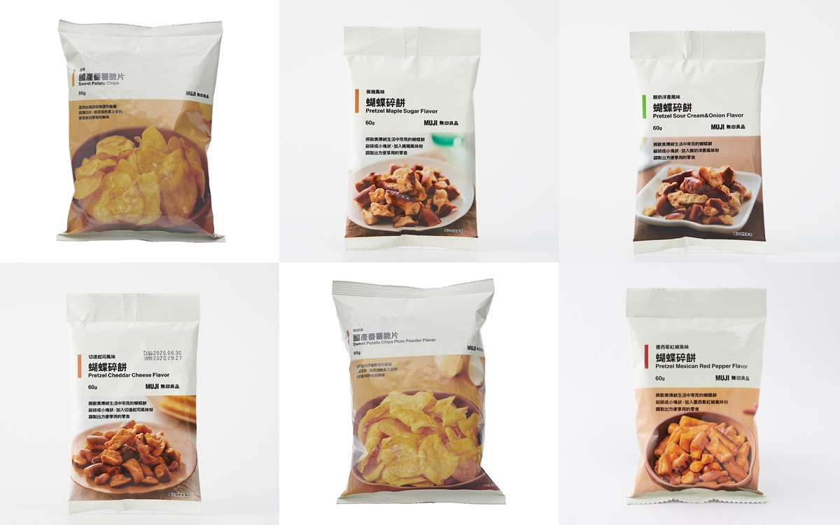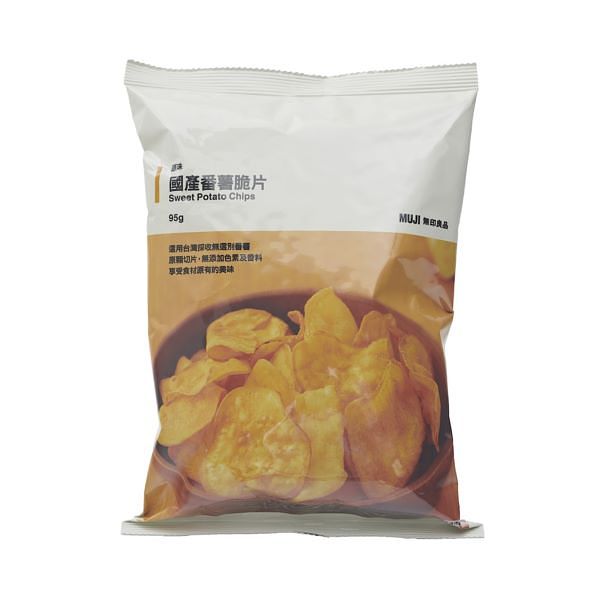 國產零食系列是由台灣無印良品企劃,強調使用在地食材,不僅有助農家增加銷售通路,也希望與顧客一同支持友善耕作下培育的農產品。MUJI無印良品的國產番薯脆片選用台灣採收無選別番薯,原顆切片,無添加色素及香料,提供原味及梅粉味。