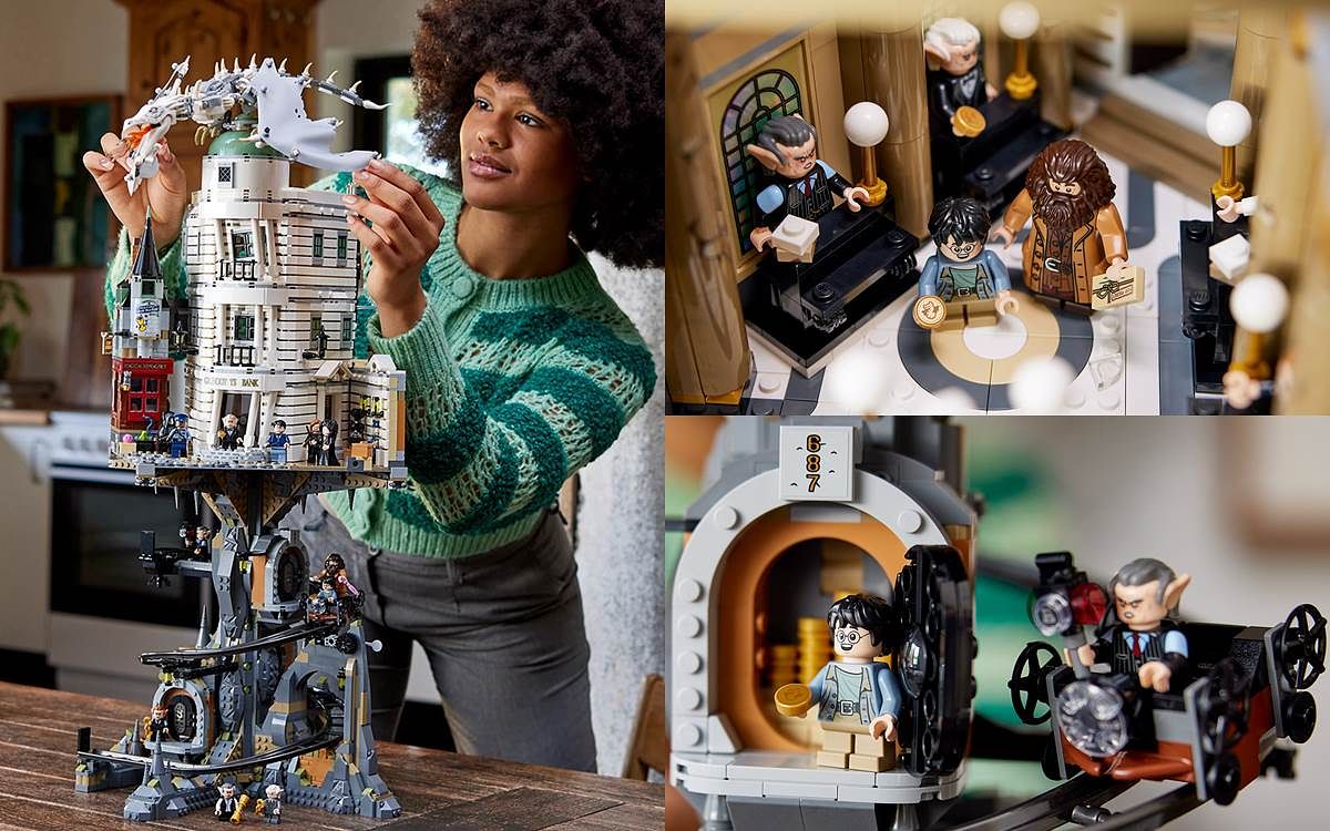 樂高重現了一些粉絲們最愛的電影場景,讓粉絲們聖誕期間與親朋友好有一起拼裝時,重溫哈利波特的奇幻故事! 「古靈閣巫師銀行」樂高盒裝完美地還原了英國巫師世界中著名的巫師銀行,細節盡入眼底,包含豪華的門廳與夾層,牆上有保險箱可存放海格的秘密書信,人偶可以搭乘軌道車抵達地下金庫,盒組也包含13 隻角色人偶,以及搭配機動特效的的烏克蘭鐵腹龍,可以讓三個人偶坐在背上,還原劇中設定,合組組裝完高達 70公分,讓粉絲們在特殊的節慶裡挑戰巨大場景,一起享受DIY的樂趣。