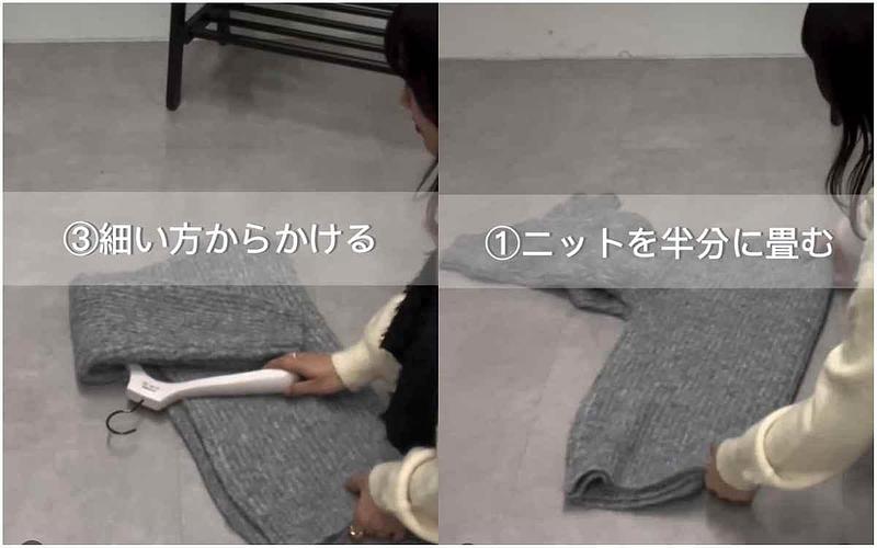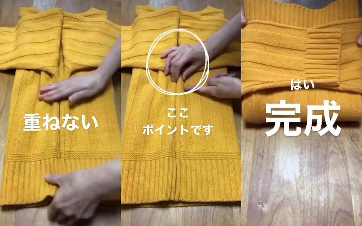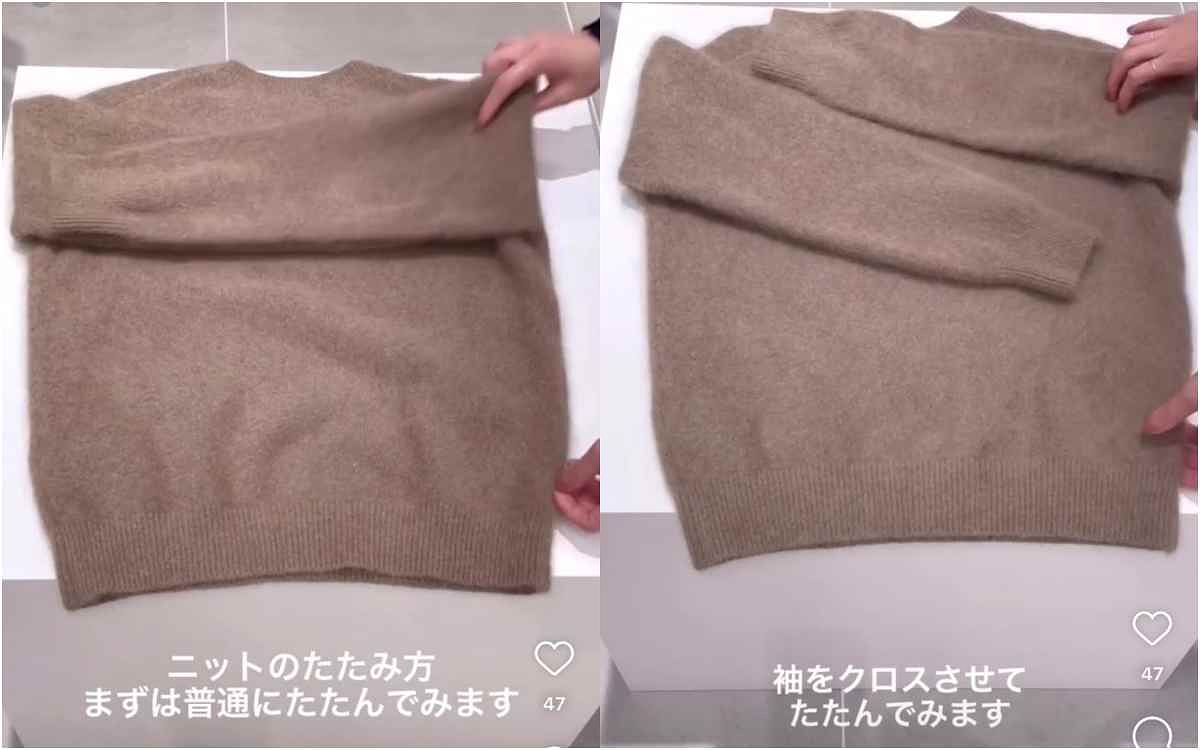 一般人最直覺的摺毛衣方式,習慣將兩隻袖子堆疊在一起,再將兩側往內摺。專家的方法是,摺疊袖子的時候改成上下交錯,然後再延續後面的摺疊方法,只要改變這一個步驟,折疊後的毛衣體積不僅不變小了,變得更好堆疊唷!