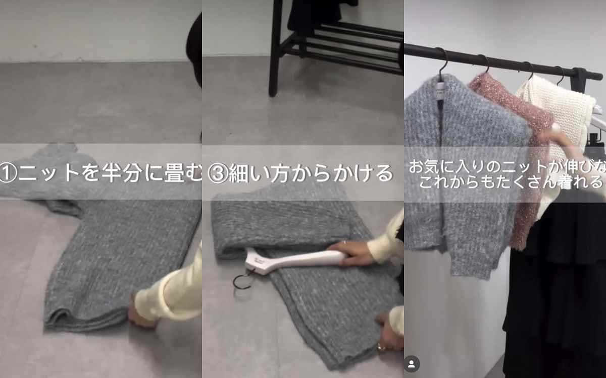 如果用一般的方法將厚重的針織毛衣吊掛起來,毛衣的重量會讓衣架在肩膀兩端壓成兩個尖角之外,也容易因為材質的關係滑落,這招摺疊吊掛法就能解決這個問題。先將毛衣兩邊對摺後,將衣架以腋下位置為中心點擺放,位於兩端的袖子與身體部份向內交叉對摺就好了!這個摺法除了可以避免讓人尷尬的「肩膀雙角」冒出來,還能為吊掛空間減半喔!